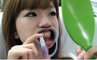 - 唇保護のためワセリンを塗り、マウスオープナーを装着後、薬剤の効果を高めるために歯の表面についた水分を拭き取ります。